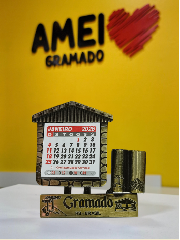 Para organizar a rotina com um toque de inspiração da Serra Gaúcha. Este porta-canetas com calendário é a peça perfeita para sua mesa, unindo a praticidade do dia a dia com a lembrança constante da paz e da beleza de Gramado.