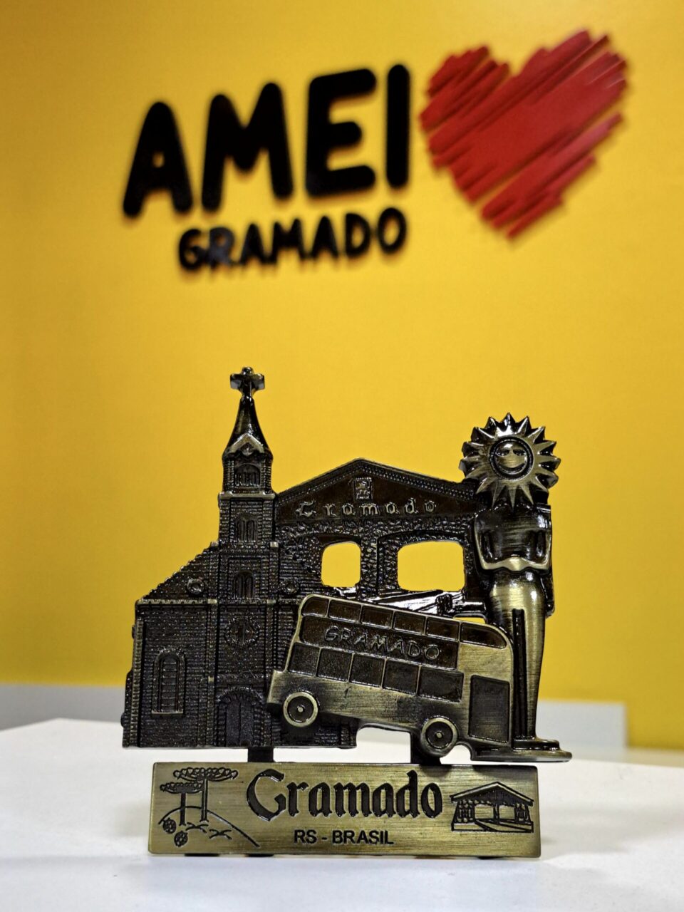 A essência de Gramado em três símbolos icônicos, unidos em uma única peça de metal. Este enfeite celebra a chegada (Pórtico), a cultura (Kikito) e o coração da cidade (Igreja), um resumo perfeito e sofisticado da sua viagem inesquecível.